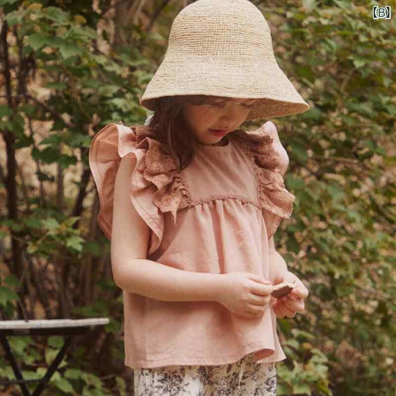 ・カテゴリ: キッズシャツ ・性別: 女児 ・対象年齢: 3~8歳 ・スタイル: カジュアル ・ネックライン: クルーネック ・袖丈: 半袖 ・柄: 無地 ・デザイン要素: ボヘミアン、田園風、フリル、プリンセス、トレンド、欧米風 ・主な素材: 綿90% ・生地加工: 柔軟加工 ・安全基準: B類 ・カラー展開: ベージュ、テラコッタ ・サイズ展開: 90cm、100cm、110cm、120cm、130cm、140cm、150cm