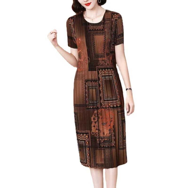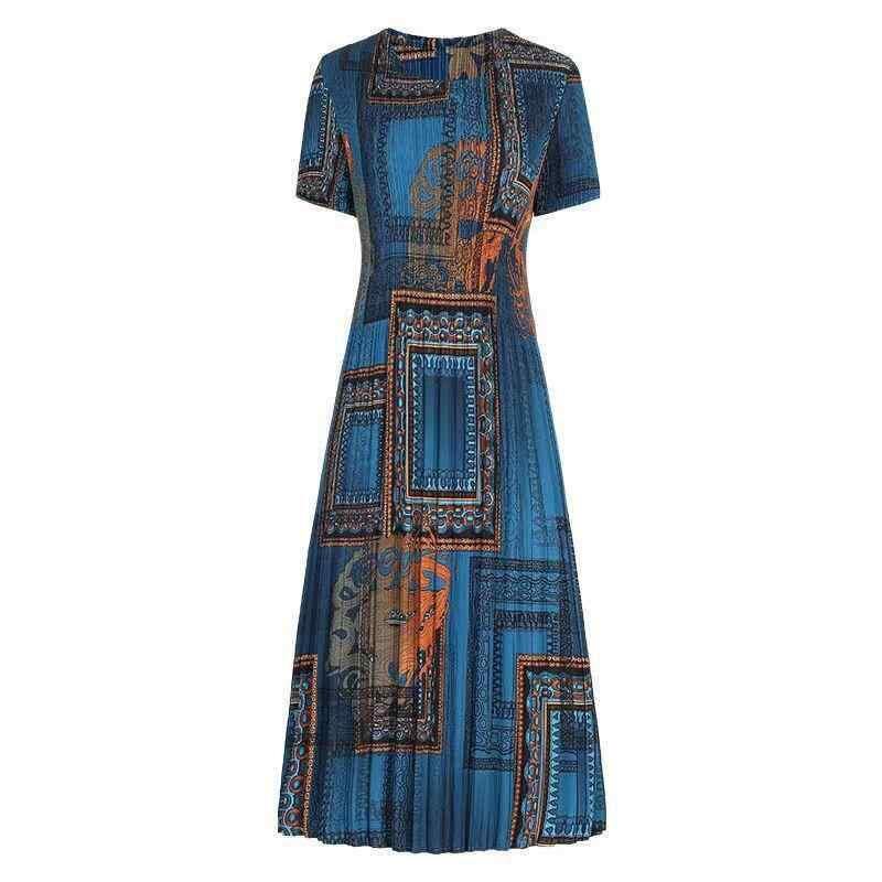 ワンピース レディース レトロ カジュアル 体型カバー ゆったり ビッグシルエット Aライン プリント 総柄 クルーネック ミモレ丈 半袖 ポリエステル ハイウエスト 普段使い お出かけ リラックス 幾何学模様