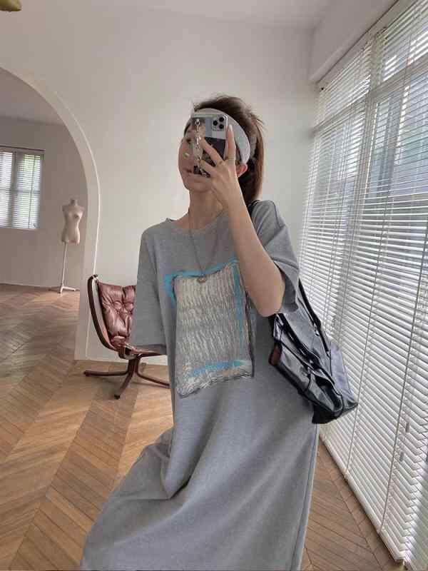 ワンピース レディース 韓国風 カジュアル ゆったり オーバーサイズ ビッグシルエット Tシャツワンピース 膝丈 ロング丈 半袖 クルーネック 数字プリント ルームウェア 部屋着 パジャマ 再生繊維 ポリエステル ピンク ライトグレー 夏
