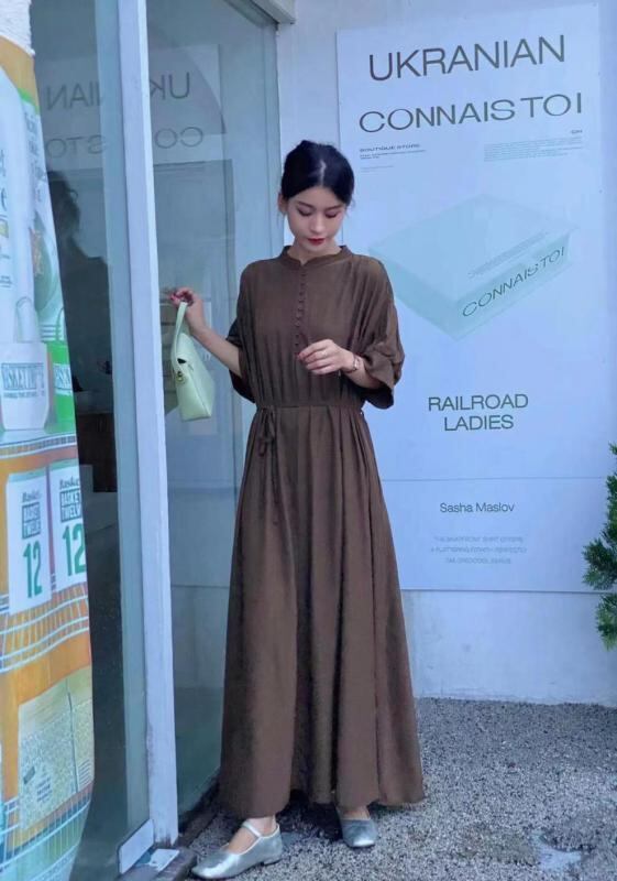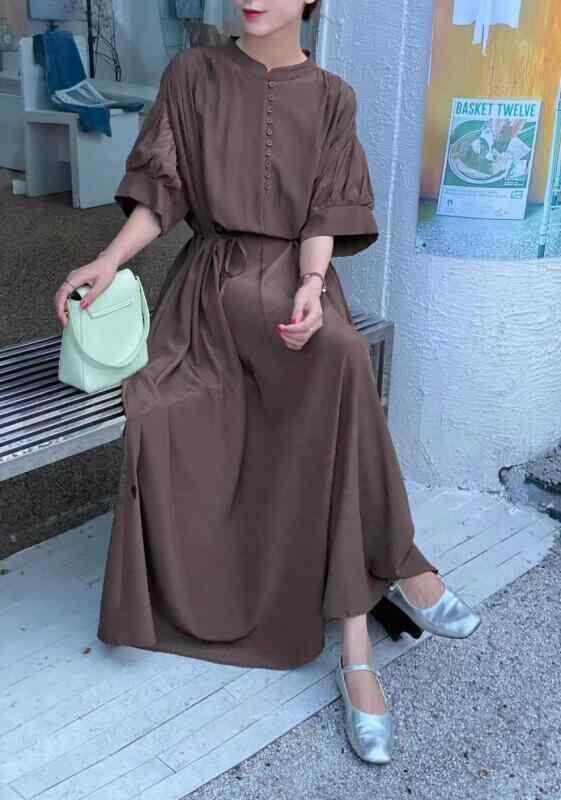 ・カテゴリ: ワンピース ・スタイル: 日韓カジュアル ・主な素材: 綿 ・素材割合: 綿80%〜90% ・丈: ロング丈 ・ネックライン: ハーフオープン ・袖タイプ: ランタンスリーブ ・袖丈: 五分袖 ・カラー展開: ブラック、レッド、カーキ、コーヒー ・サイズ展開: フリーサイズ