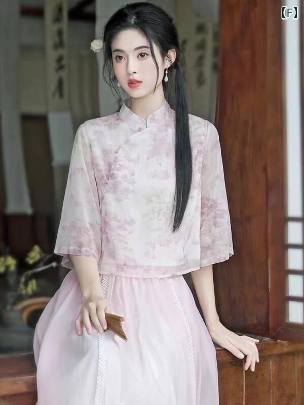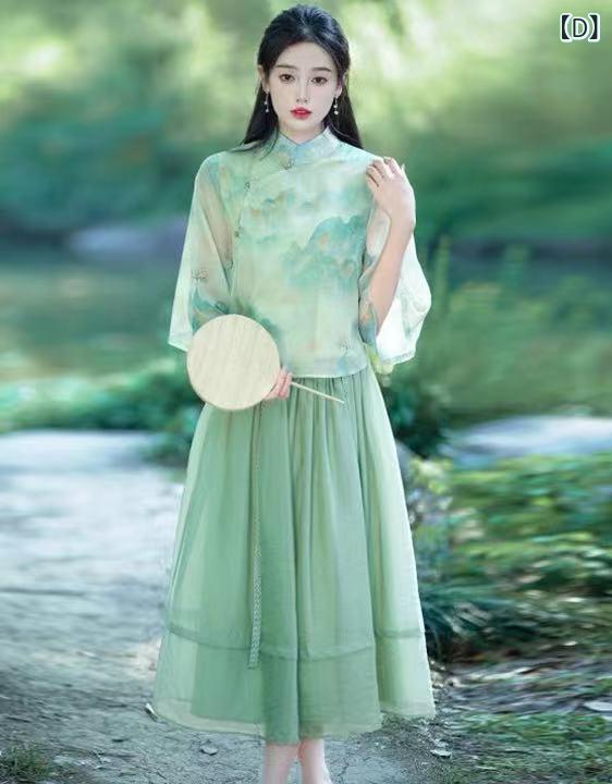 チャイナドレス チャイナワンピース レディース 新中華風 レトロ 改良型 禅意 茶芸服 エレガント 優雅 セットアップ ツーピース アセテート繊維 デジタルプリント ボタンデザイン フリーサイズ | cybercart
