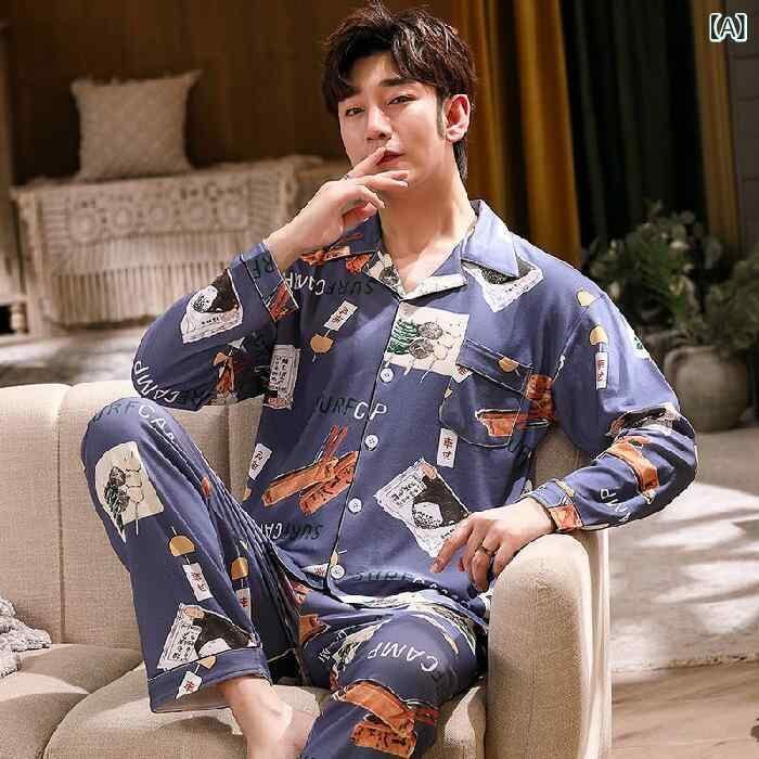 パジャマ メンズ 男性用 青年 前開き 上下セット 春 秋 薄手 ゆったり ポリエステル綿混 キャラクター柄 冷房対策 ルームウェア 部屋着 快適 リラックス 普段使い