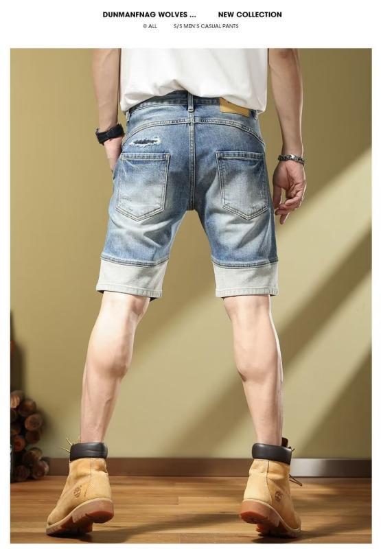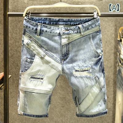 デニムパンツ メンズ 薄手 ストレッチ ハーフパンツ パッチワーク ダメージ加工 ゆったり アメカジ ストリート カジュアル 夏物 ブルー コットン 五分丈