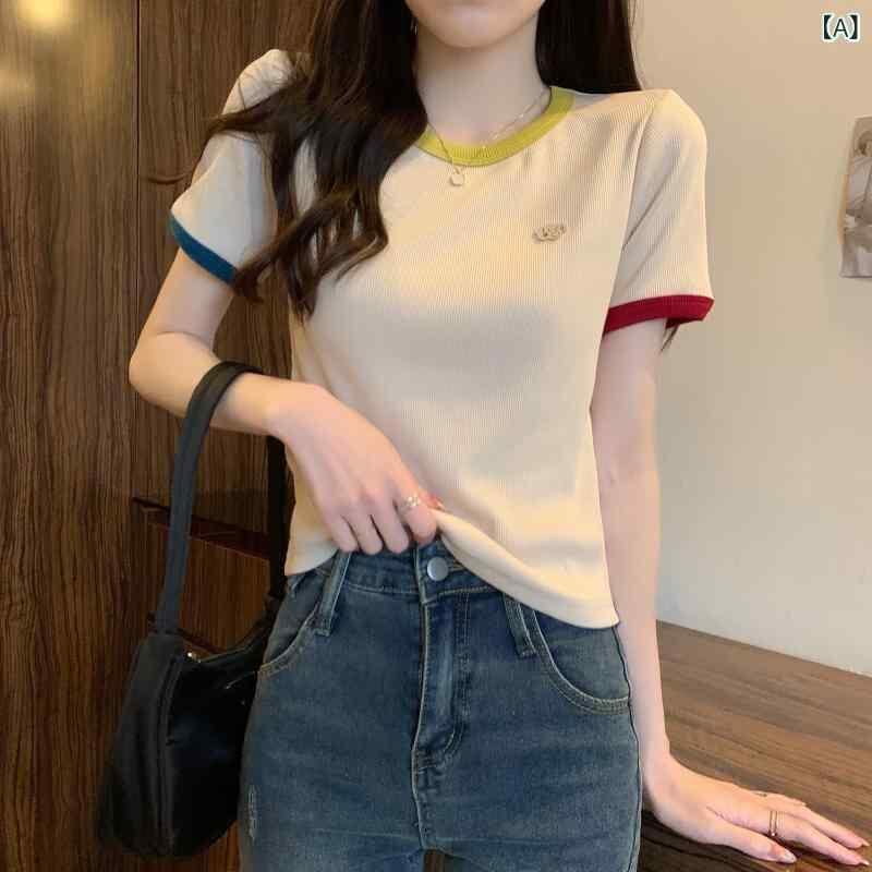 Tシャツ レディース ラウンドネック バイカラー 半袖 ショート丈 カジュアル スリムフィット 着痩せ効果 コットンブレンド リブ編み ストレッチ素材 アプリコットカラー フェミニン トップス