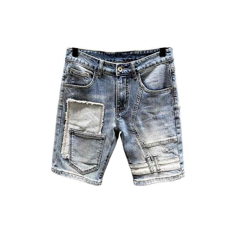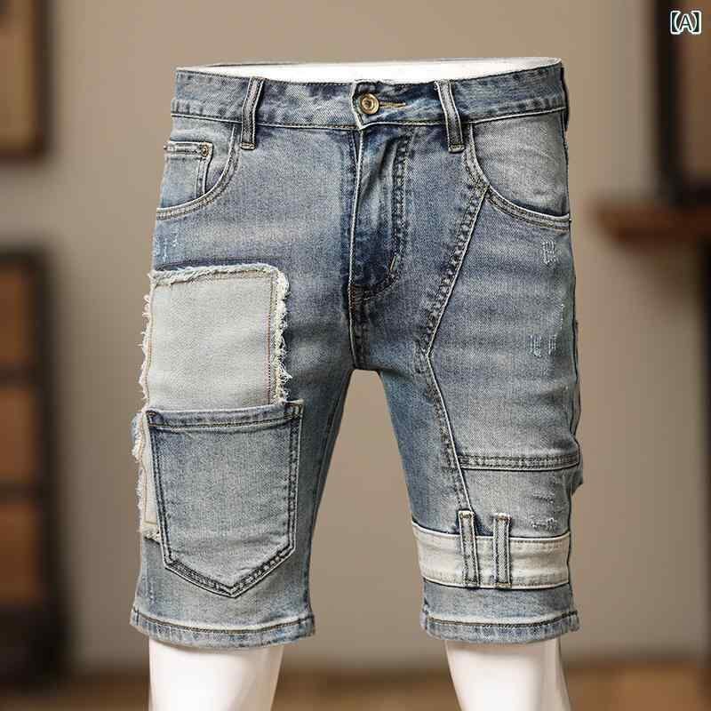 パンツ メンズ デニム ライトブルー ダメージ加工 パッチワーク 個性的 5分丈 ショートパンツ ハーフパンツ ストレート 伸縮性 カジュアル 夏