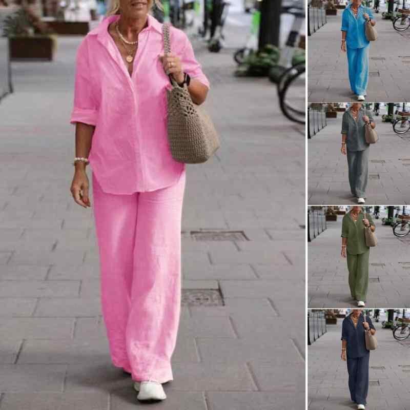 セットアップ レディース 長袖 シャツ 襟付き 無地 ワイドパンツ ロング丈 綿麻 カジュアル 通勤 きれいめ リラックス 普段使い 大きいサイズ 多色展開
