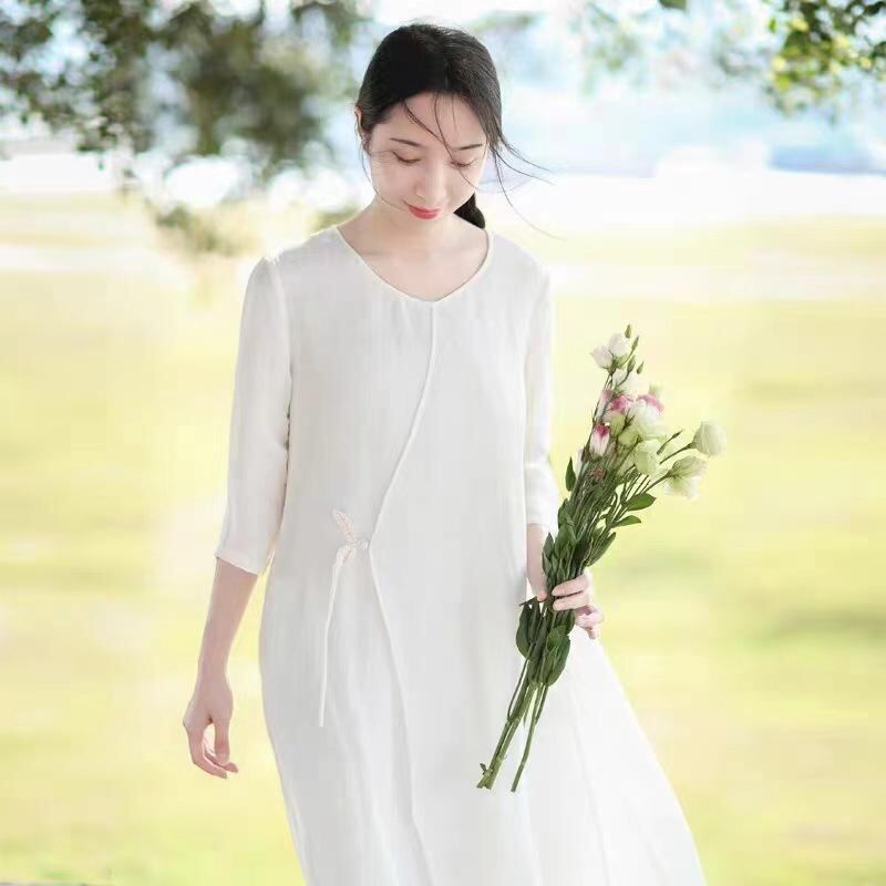 ワンピース レディース 中国風 綿麻 禅意 レトロ ゆったり 大きいサイズ 体型カバー 茶道服 Aライン ロング丈 七分袖 ラウンドネック ウエストリボン 春 夏 エレガント 上品 通勤 デイリーユース リラックス ナチュラル 軽やか