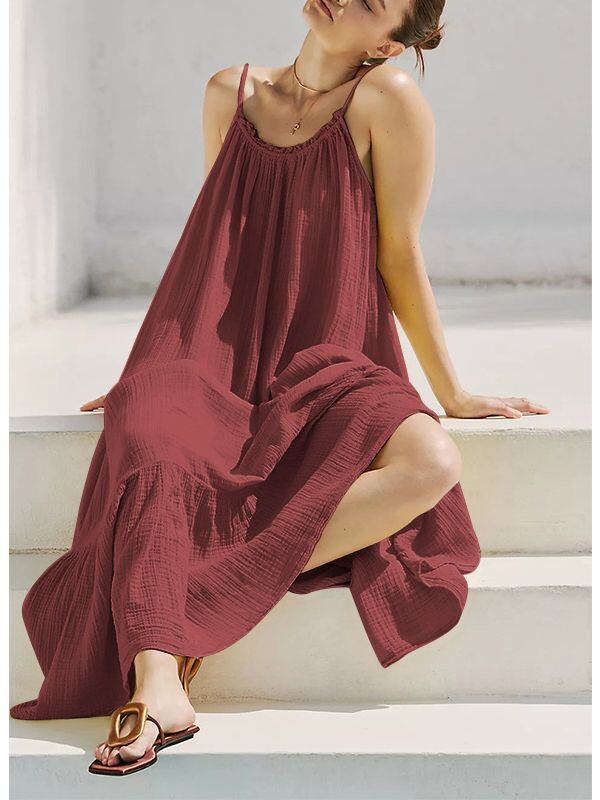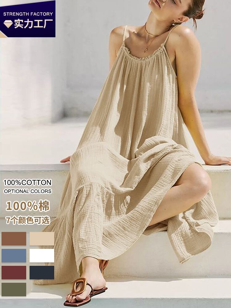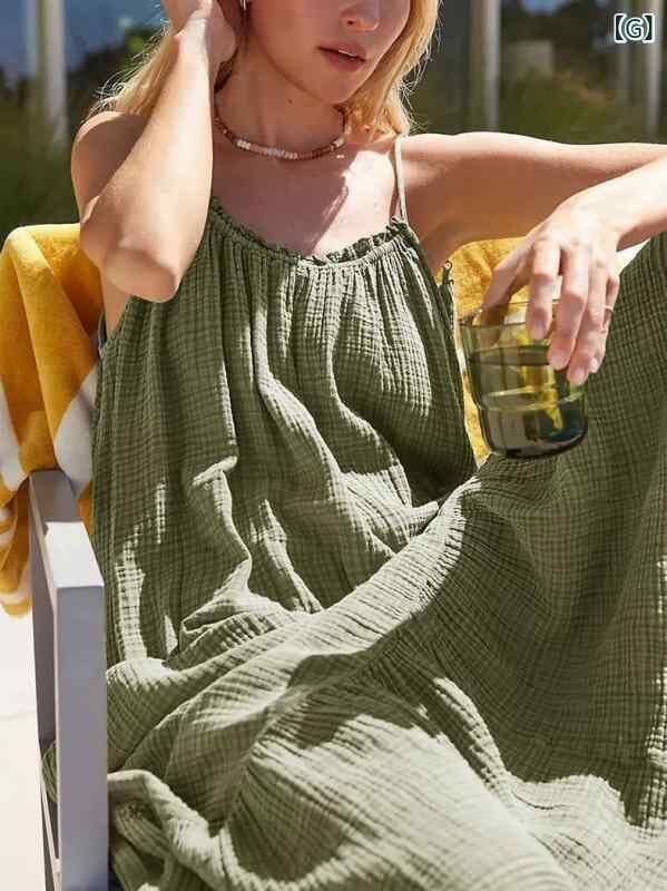 ワンピース レディース フレンチレトロ エレガント コットン シボ感 キャミソールワンピース 肌触り優しい フリル メロウ Aライン ミディ丈 ゆったりリラックスシルエット 上品な普段使い 着回し万能 体型カバー