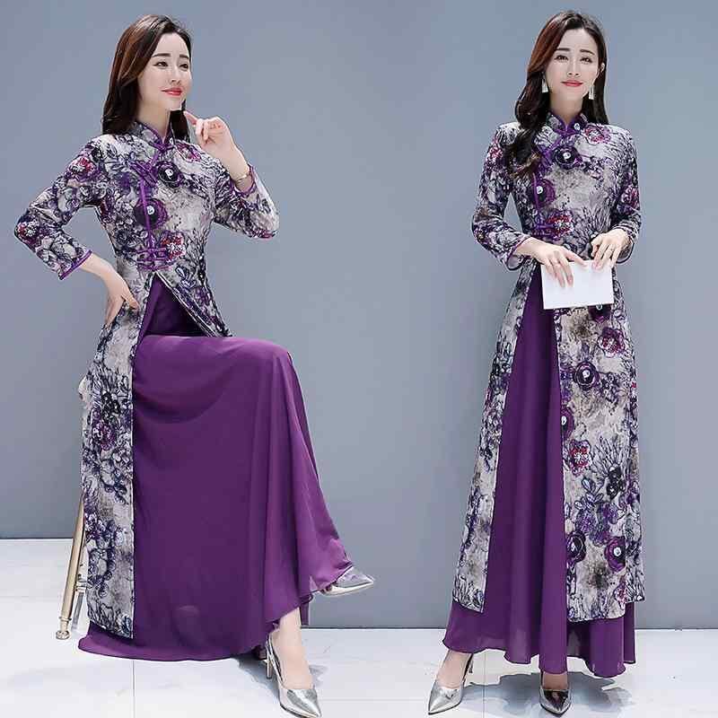 ワンピース レディース ロング丈 ベトナムアオザイ チャイナドレス 改良デザイン エレガント 民族風 エスニック ベルベット調 ベロア素材 高級感 綿混 スタンドカラー 長袖 伸縮性 ストレッチ パープル マカロンカラー レトロ クラシック