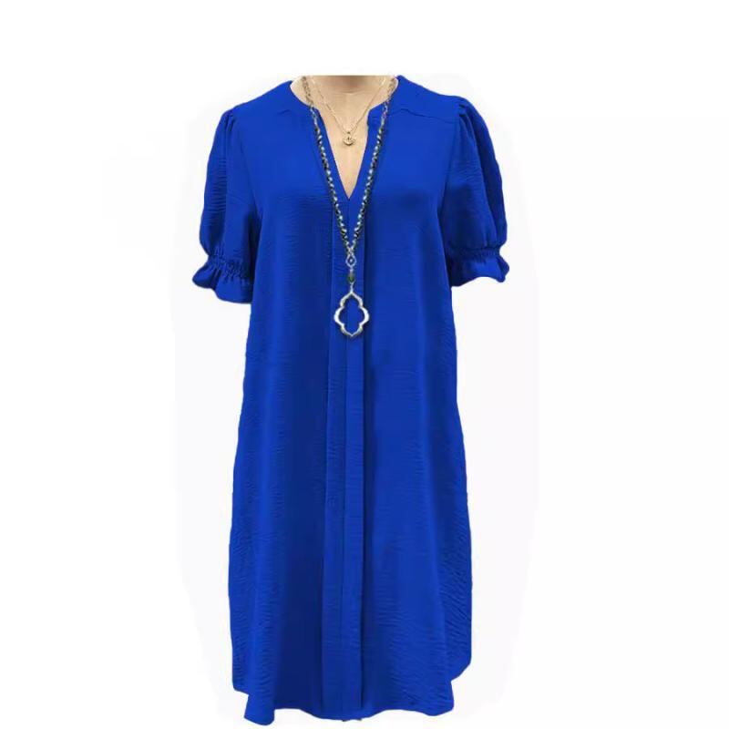 ワンピース レディース 無地 Vネック ゆったり 五分袖 パフスリーブ ギャザー ハイウエスト ミディ丈 Aライン ポリエステル レトロ フェミニン