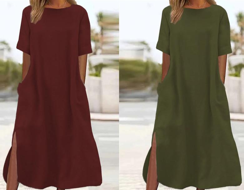 ワンピース レディース 大きいサイズ ロング丈 マキシ丈 カジュアル Aライン プルオーバー スキッパーネック 五分袖 ミドルウエスト 綿麻 無地 快適 体型カバー