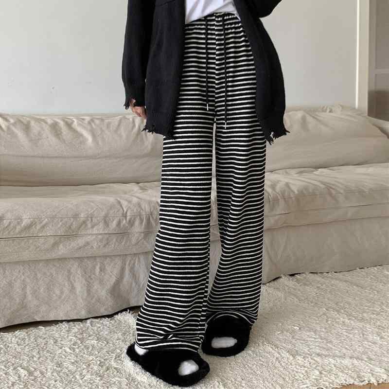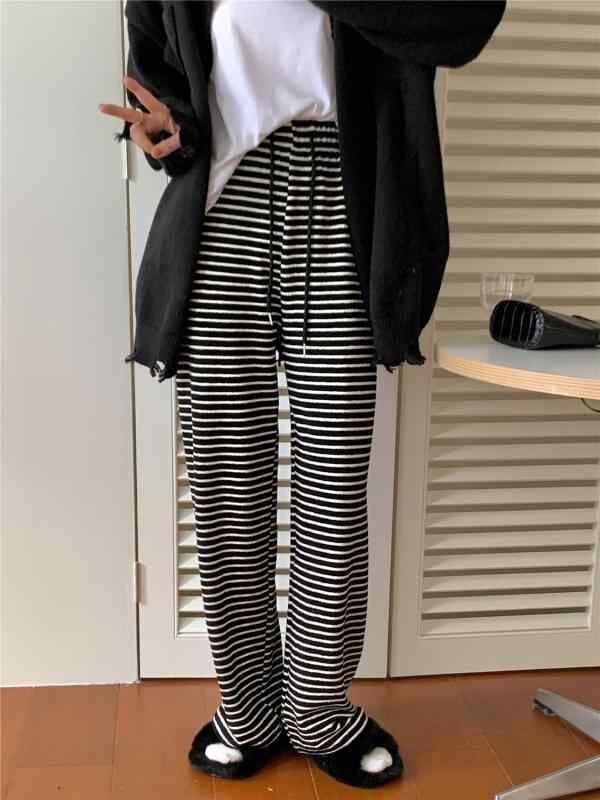カジュアルパンツ レディース ストライプ柄 ハイウエスト ストレート ストレッチ 着痩せ ドレープ感 厚手 保温 あったか ロング丈 ポリエステル ポリウレタン 黒 アプリコットカラー
