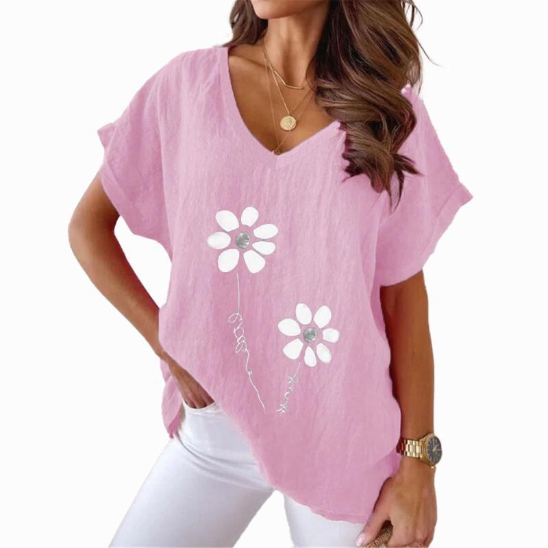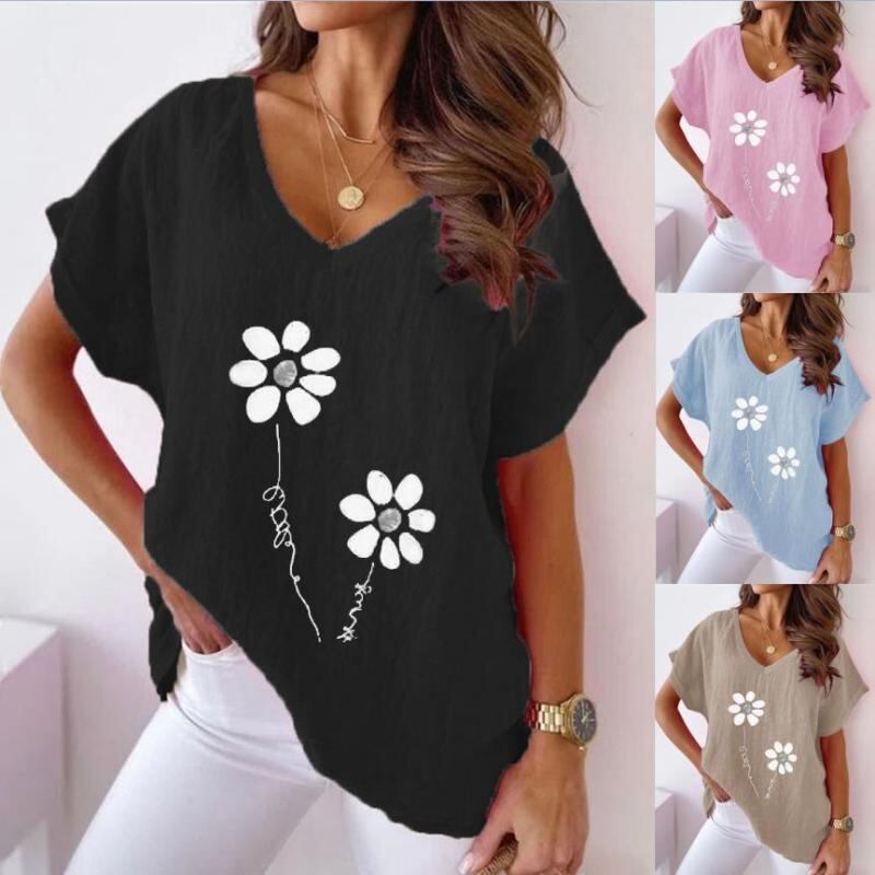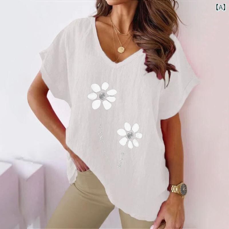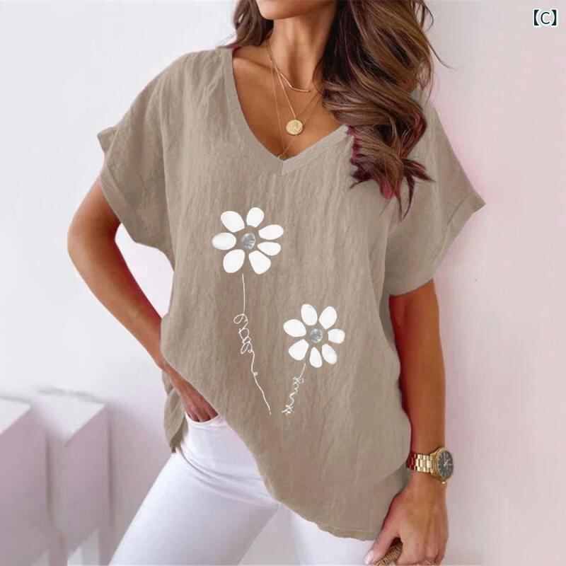 Tシャツ レディース ゆったり 大きいサイズ Vネック ドルマンスリーブ 半袖 綿麻 ボタニカル柄 花柄 チュニック丈 オーバーサイズ ビッグシルエット カジュアル 普段使い リラックス