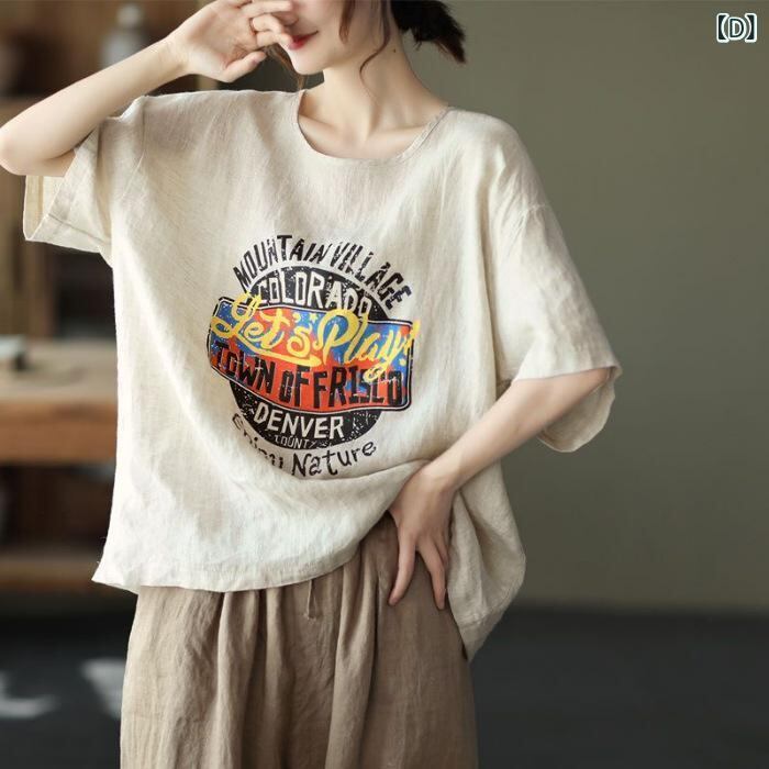 Tシャツ レディース 大きいサイズ プラスサイズ 夏服 ゆったり オーバーサイズ ルーズフィット 体型カバー 着痩せ 若見え プリント柄 綿麻 半袖 トップス ラウンドネック カジュアル レトロ ヴィンテージスタイル ブラウン イエロー ピンク 生成り