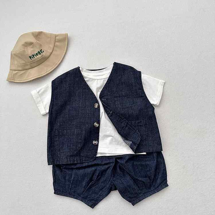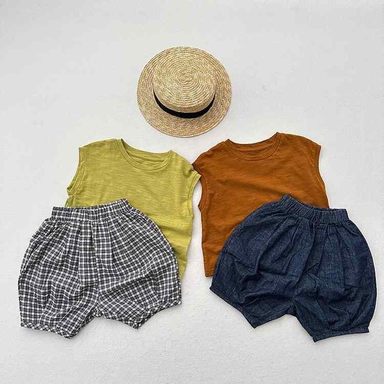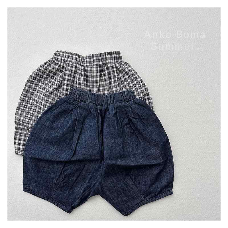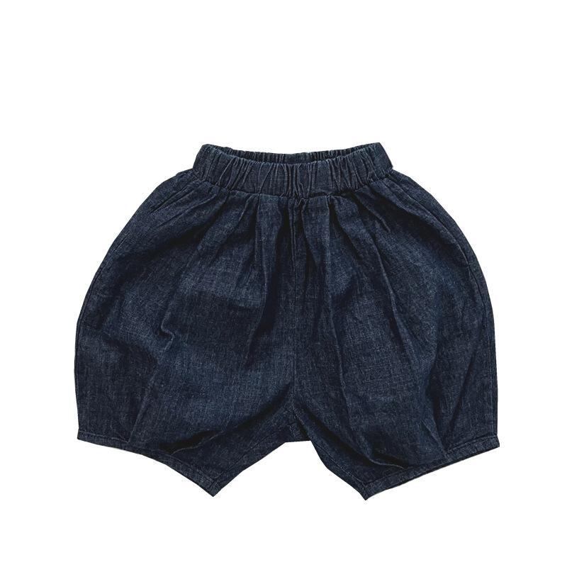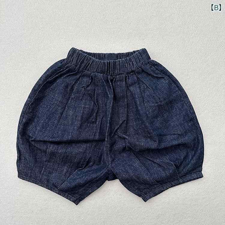 キッズ 男女兼用 綿麻 デニム ハーフパンツ 六分丈 ショートパンツ 夏物 ゆったり おしゃれ カジュアル 細チェック デニムブルー かぼちゃパンツ バルーンパンツ