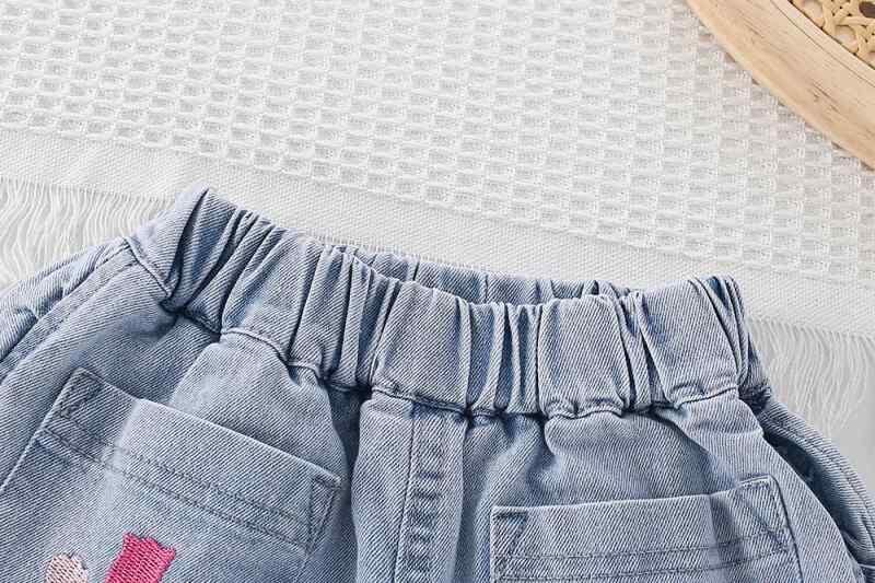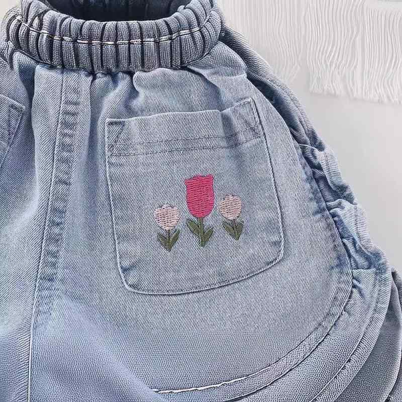 ショートパンツ ベビー 女の子 コットン デニム 夏 韓国風 花苞ウエスト ゴム入り ソフトデニム 伸縮性 普段着 通園 通学 カジュアル ブルー チューリップ刺繍