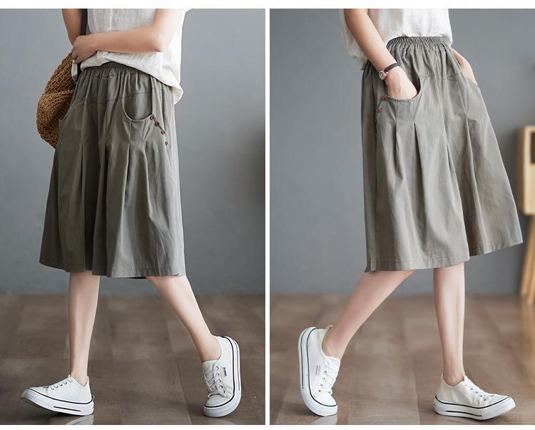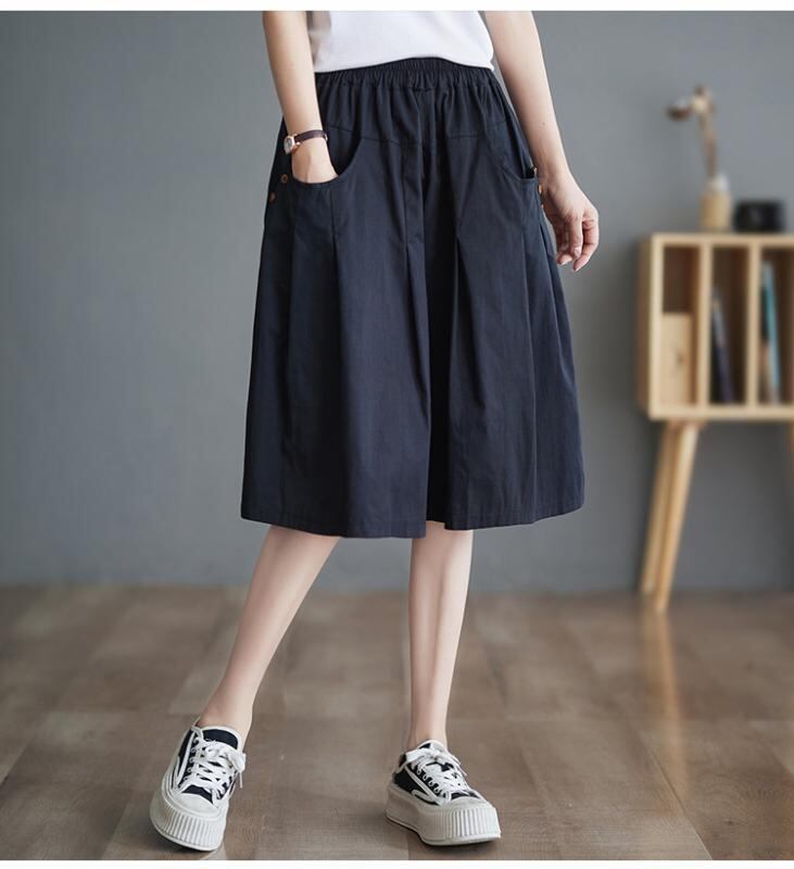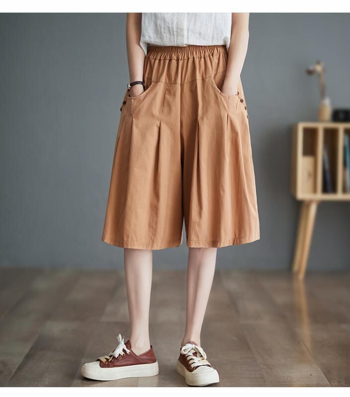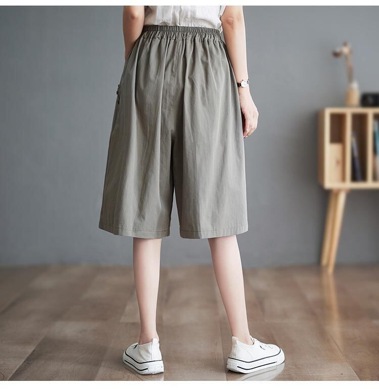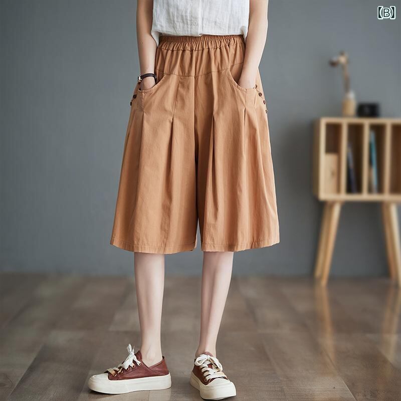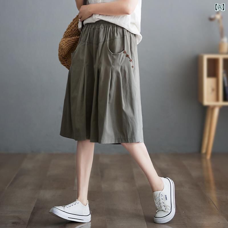 パンツ レディース ハイウエスト ワイドシルエット 五分丈 袴パンツ コットン 薄手 軽量 ゆったり ポケット付き カジュアル リラックス 黒 ライトグリーン オレンジ 3色展開