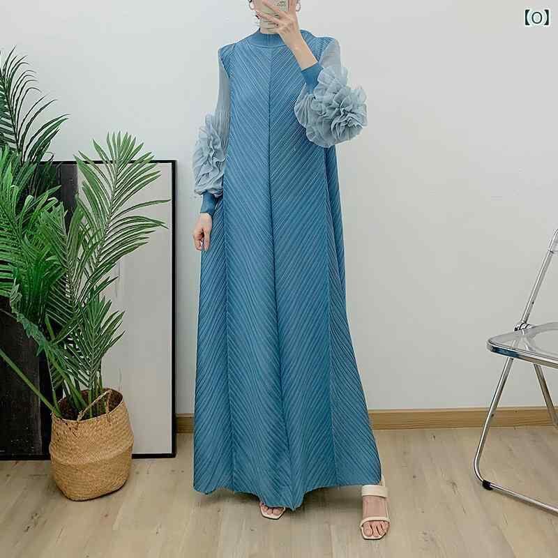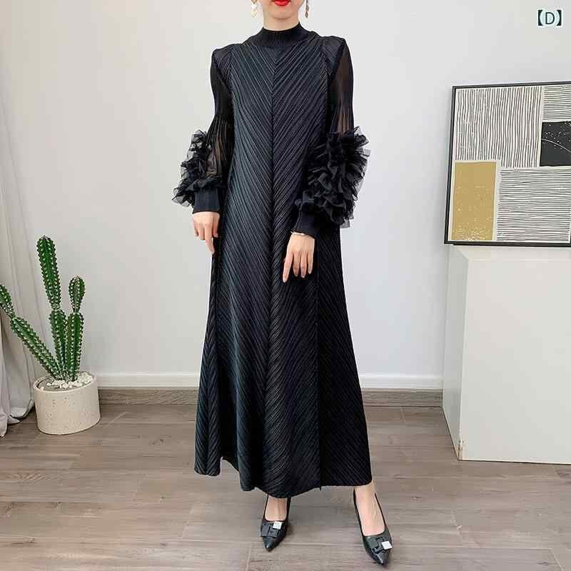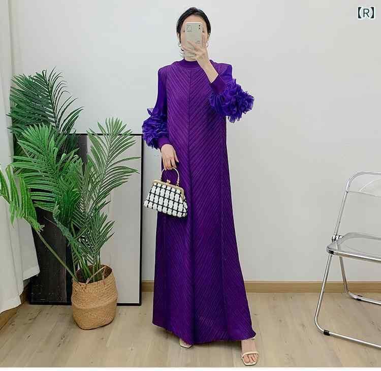 ワンピース レディース ロング丈 ゆったり 大きいサイズ 無地 プリーツ フレア スタンドカラー 長袖 プルオーバー ポリエステル エレガント 通勤 カジュアル