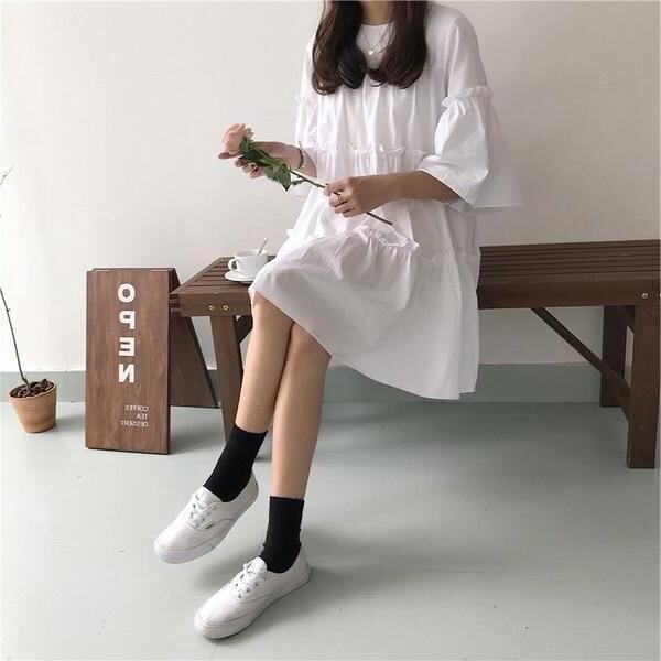 ワンピース レディース 韓国風 香港スタイル レトロ カジュアル ゆったり プラスサイズ ベビードール ベルスリーブ フレアスリーブ 夏 ミモレ丈 Aライン ラウンドネック シアー素材 メッシュ 無地切り替え フェミニン ホワイト ブラック