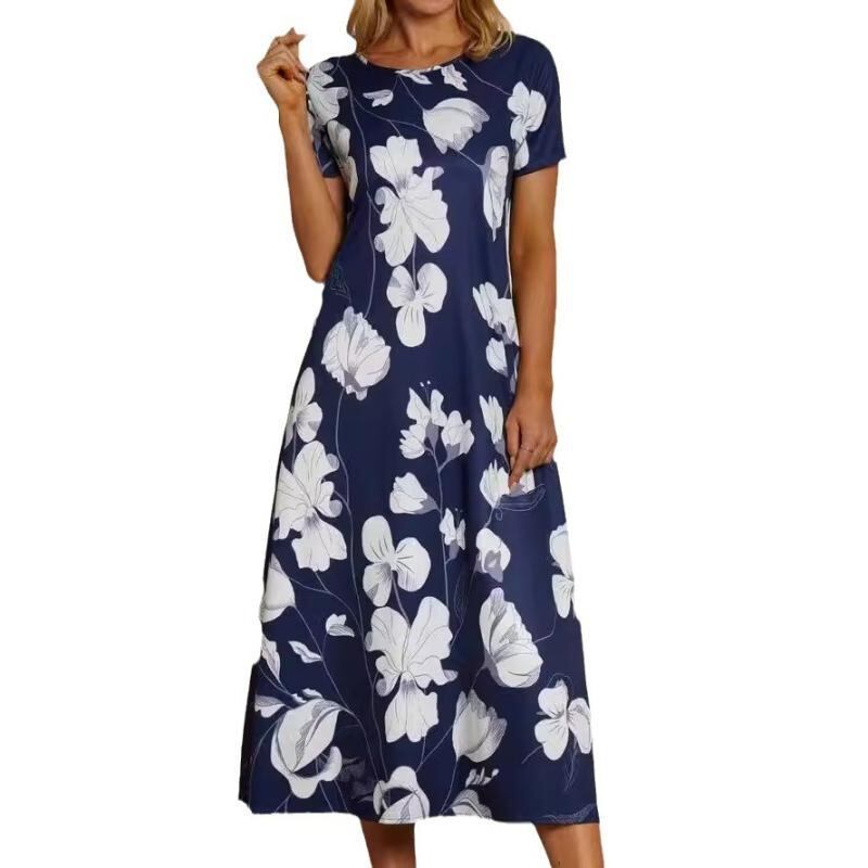 ワンピース レディース Aライン ロング丈 半袖 ゆったり クルーネック 総柄 プリント 抽象 花柄 ポリエステル スパンデックス カジュアル 普段使い ストリートファッション ホワイト リラックスフィット