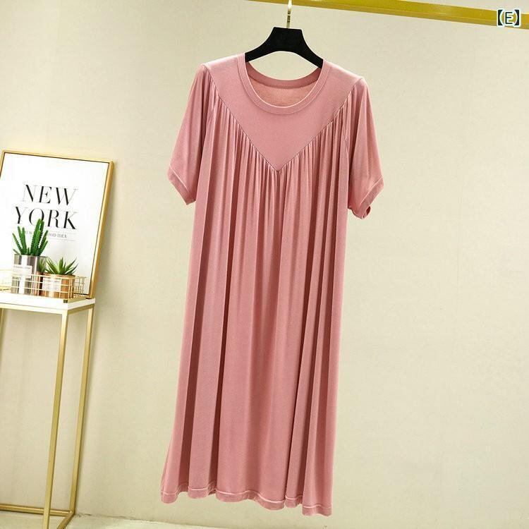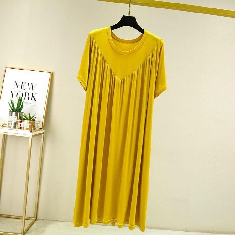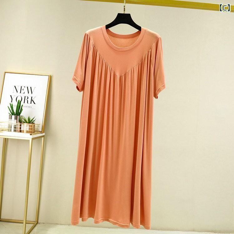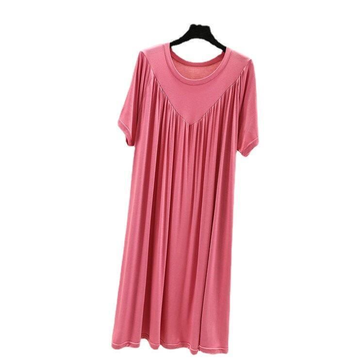 ワンピース レディース 大きいサイズ プラスサイズ モダール素材 ポリエステル混紡 ゆったり 体型カバー 無地 薄手 軽量 半袖 クルーネック ミディ丈 Aライン プリーツ 部屋着 ルームウェア デイリーユース 外出着 通勤 オフィスカジュアル