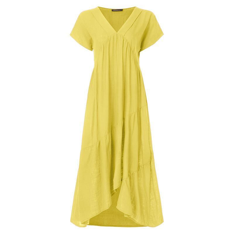 ワンピース レディース 大きいサイズ ゆったり リラックスフィット 綿麻 Vネック 半袖 ミディ丈 無地 ギャザー プリーツ アシンメトリーヘム 通勤 オフィス エレガント 豊富なカラー展開