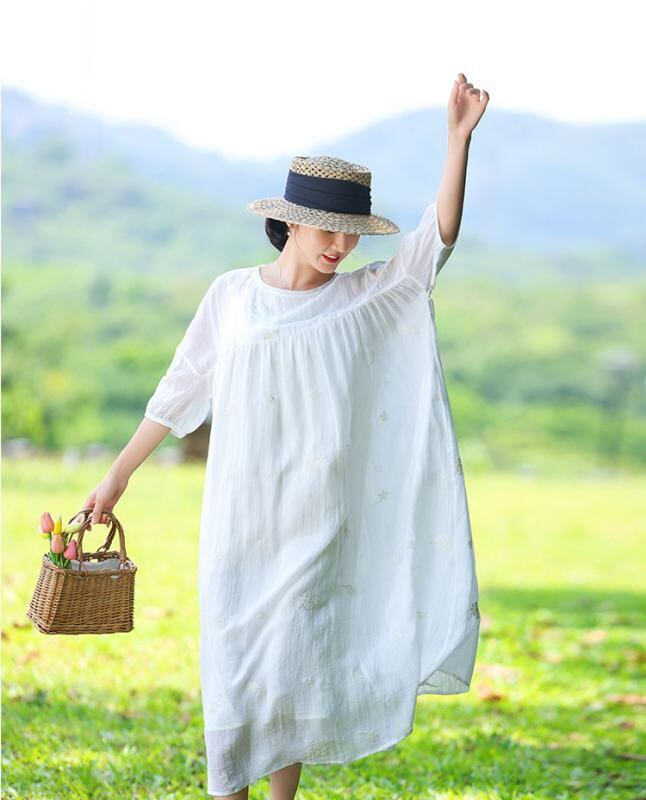 ・カテゴリ: ワンピース ・スタイル: ナチュラルレトロ ・主な素材: 苧麻50~70% ・柄: 無地 ・加工: 刺繡 ・丈: ミディ丈 ・スカートシルエット: フレア ・ネックライン: クルーネック ・袖丈: 五分袖 ・ウエスト: ゆったり ・デザイン: ヴィンテージ加工 ・開閉: プルオーバー ・カラー展開: ホワイト ・サイズ展開: S、M、L