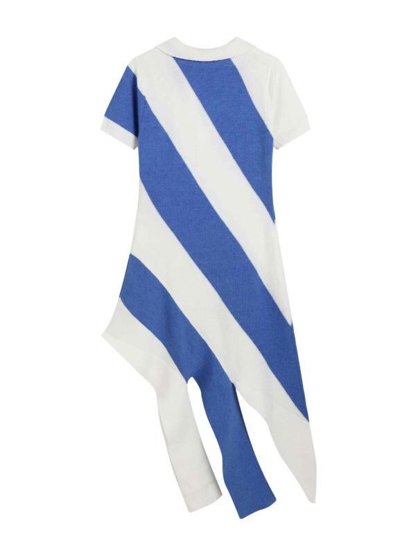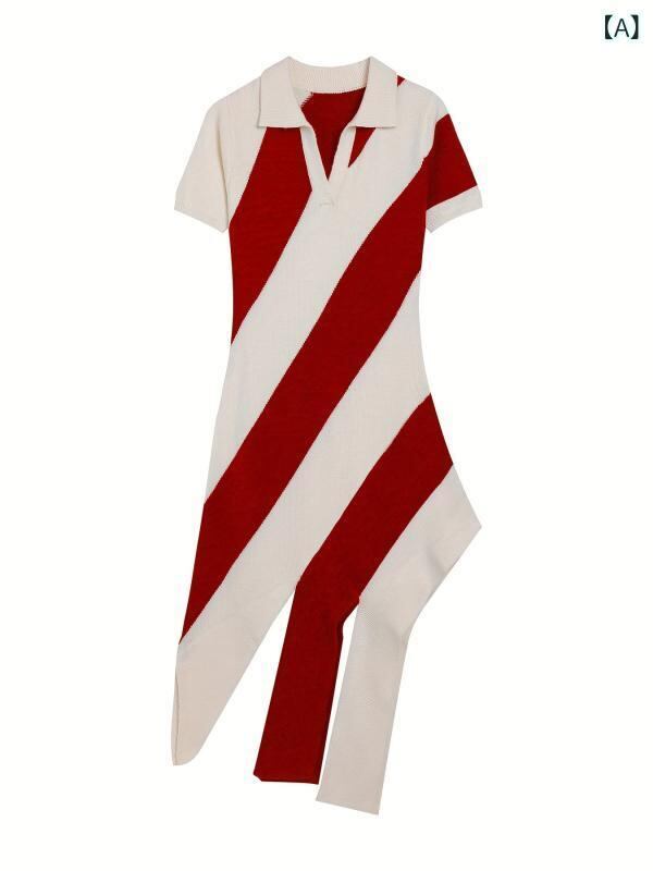 ワンピース ニット スリム ポロ襟 半袖 フリンジ ストライプ マルチカラー アシンメトリー ウール素材 ミドルウエスト ミニ丈 ストリート系 個性的 カジュアルスタイル プルオーバー