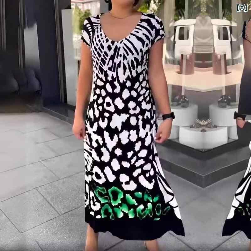 ワンピース レディース 欧米風 Vネック 半袖 花柄プリント ゆったり ロング丈 Aライン ミモレ丈 ポリエステル 体型カバー カジュアル リゾート お出かけ