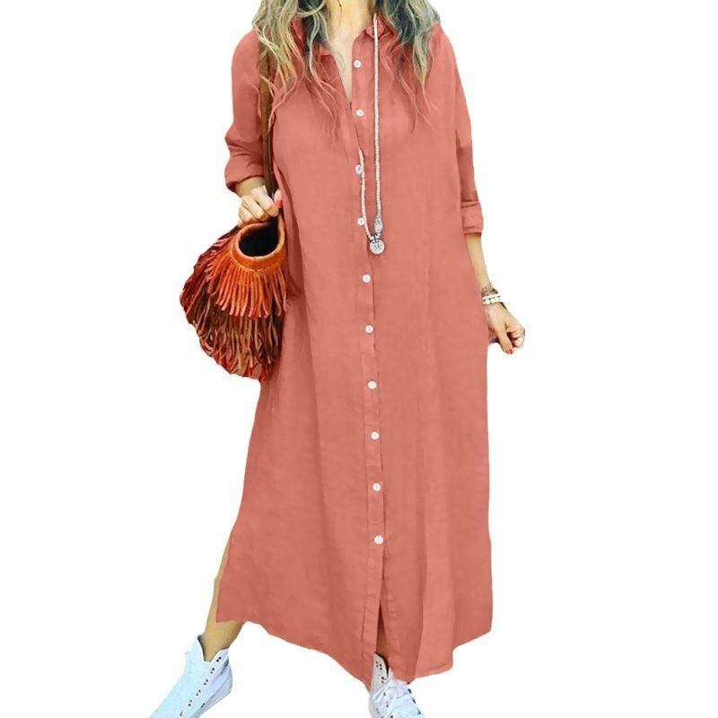 ワンピース シャツワンピース 綿麻素材 混紡 前開き シングルボタン 長袖 襟付き ゆったり ロング丈 無地 シンプル エレガント 通勤 オフィス カジュアル 普段使い バイカラー リラックスフィット 珊瑚色 焦糖色 ダークブルー