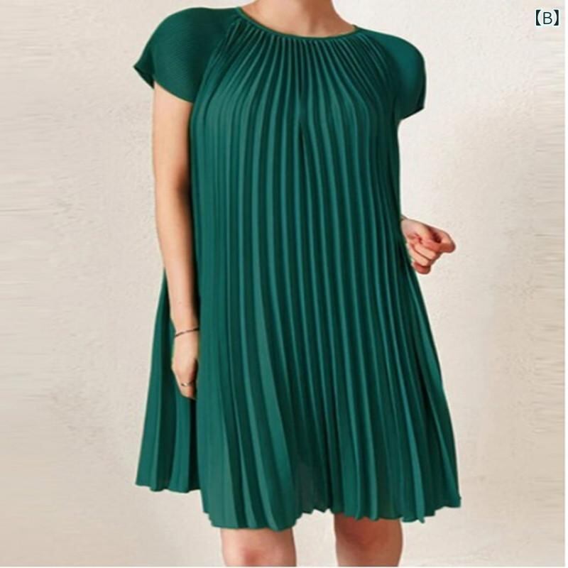 ワンピース レディース ラウンドネック 半袖 プリーツ ゆったり ポリエステル ミディ丈 アシンメトリー 切り替え ラグランスリーブ ミドルウエスト エレガント 通勤 オフィス カジュアル 快適 普段使い ブラウン ダークグリーン ブラック