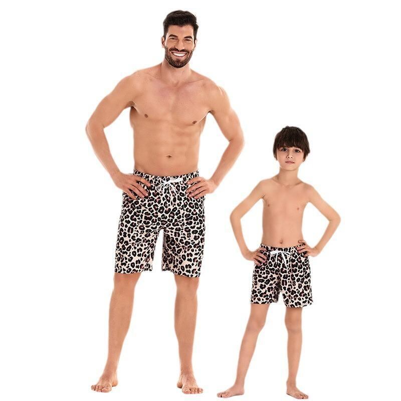 スイムショーツ メンズ 男の子 親子 お揃い ビーチパンツ 水着 プリーツウエスト ポケット付き ヒョウ柄 ナイロン スパンデックス素材 伸縮性 ランニング スイミング マリンスポーツ 普段使い カジュアル