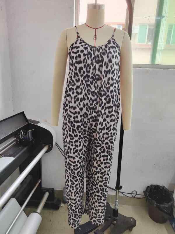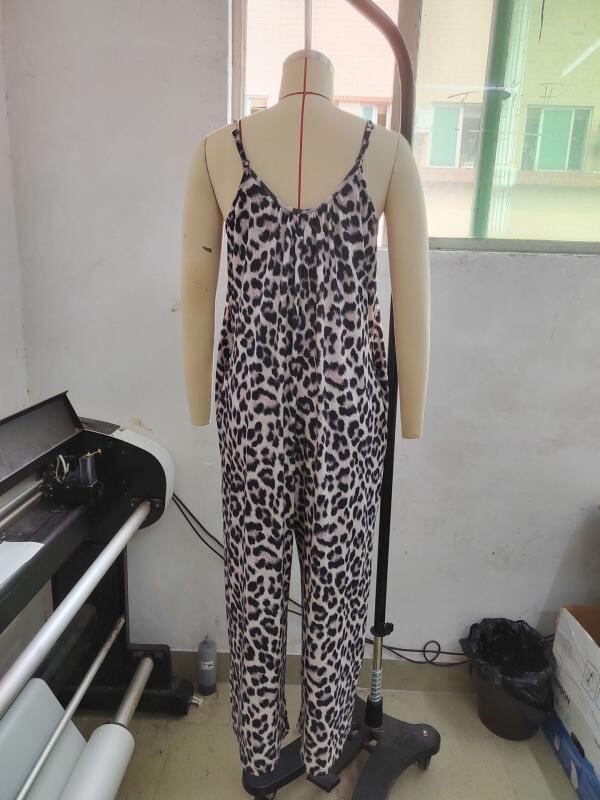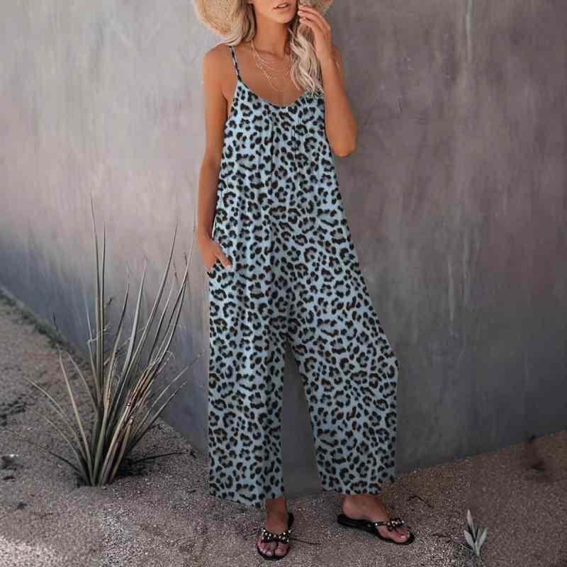 オールインワン レディース カジュアル ノースリーブ キャミソール ヒョウ柄 ゆったり ワイドパンツ ロング丈 ポケット付き サロペット ポリエステル 伸縮性 ストリートファッション リラックスウェア カーキ ブラウン ブルー