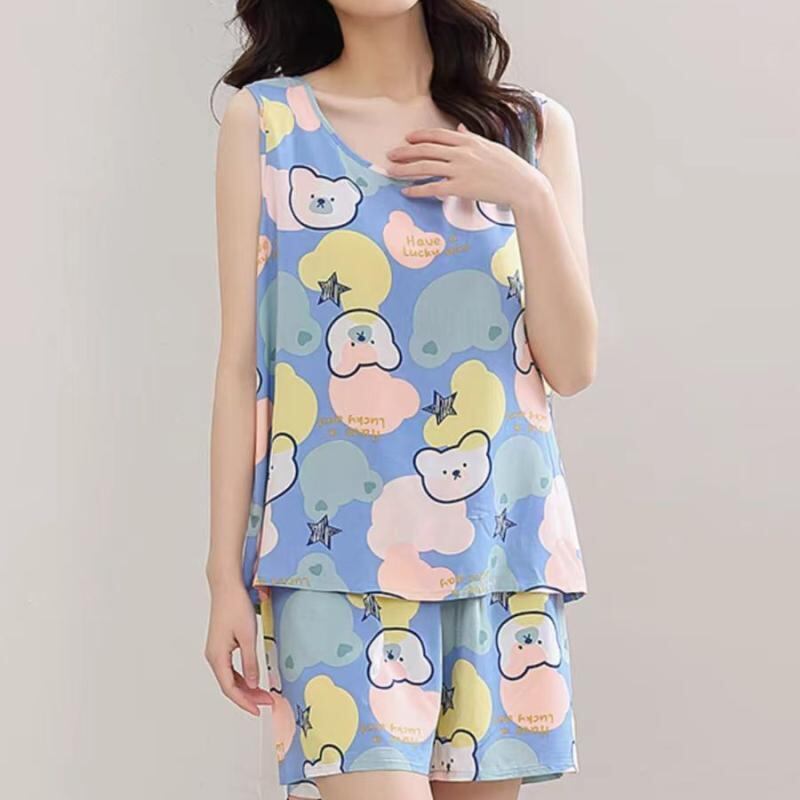 パジャマ レディース 夏用 綿混 再生繊維 ノースリーブ タンクトップ ショートパンツ ハーフパンツ 2点セット 韓国風 大きいサイズ ゆったりサイズ ルームウェア 部屋着 薄手 軽量 セットアップ ラウンドネック 通気性