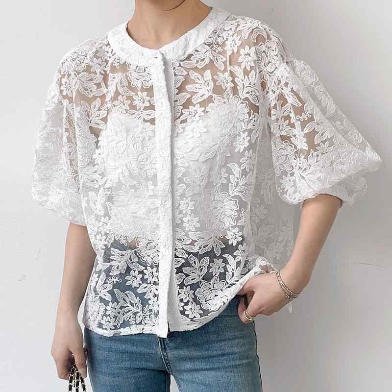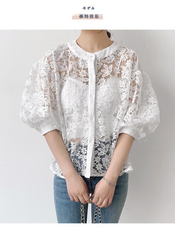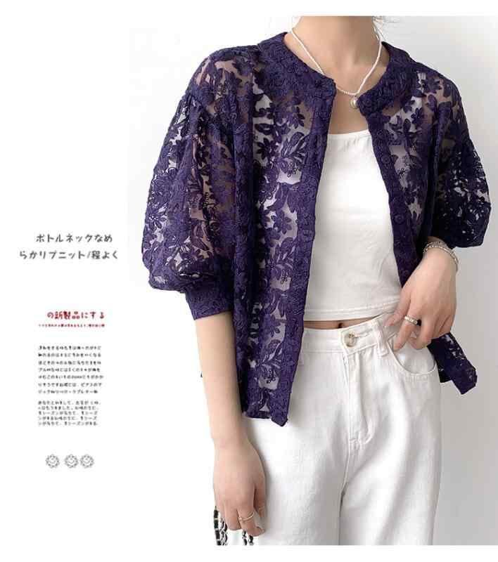 ブラウス レディース 長袖 ラウンドネック レース ランタンスリーブ バルーンスリーブ カーディガン 羽織り トップス ストレートシルエット 透け感 フェミニン 甘め カジュアル きれいめ 普段使い パープル ホワイト ブラック フリーサイズ