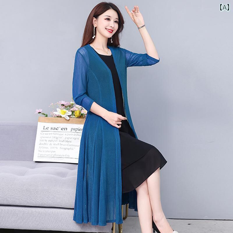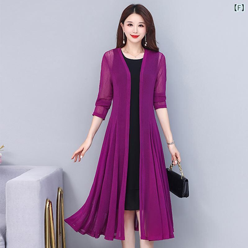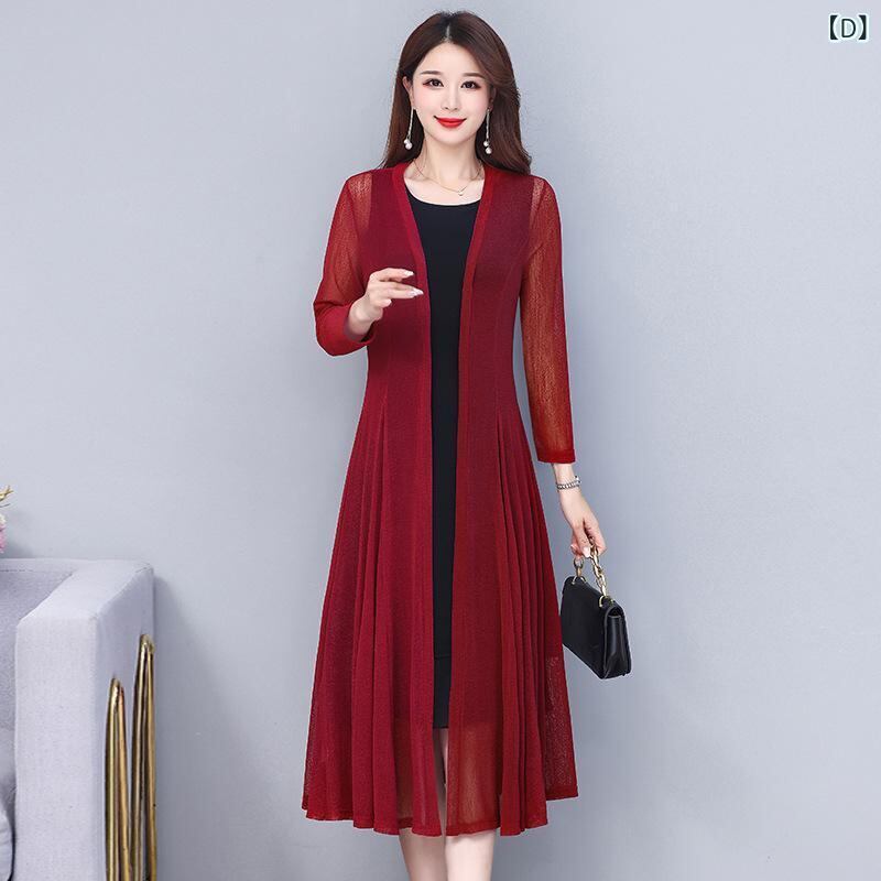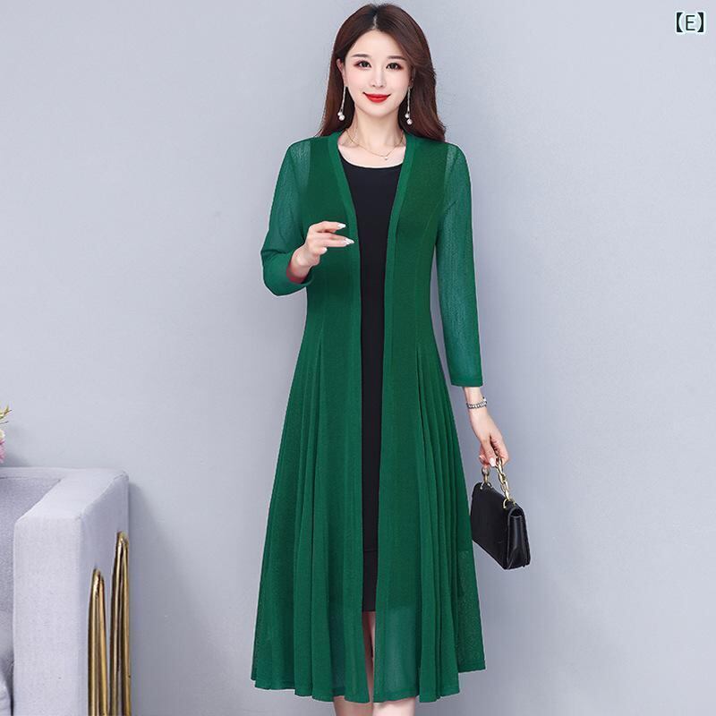 ・主な素材: ポリエステル90〜95%(ネット生地)・スタイル: カーディガン・シルエット: フレア・着丈: ミドル丈(約65cm~80cm)・ネックライン: Vネック・袖タイプ: レギュラー・袖丈: 長袖・カラー展開: レイクブルー、ロイヤルブルー、ブラック、ワインレッド、ダークグリーン、フューシャピンク・サイズ展開: XL、2XL、3XL、4XL、5XL・テイスト: エレガント、通勤スタイル・性別: レディース