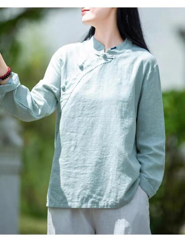 シャツ レディース トップス 女性用 長袖 立ち襟 スタンドカラー 綿麻 リネン ポリエステル 無地 ゆったり 体型カバー 中国風 チャイナ風 盤扣 チャイナボタン レトロ クラシック 通勤 カジュアル リラックス 普段使い エレガント
