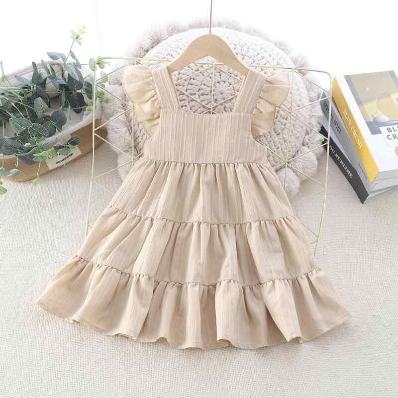 ワンピース 女の子 子供服 キッズ 夏 ノースリーブ フリル袖 無地 韓国風 おしゃれ かわいい プリンセスライン フレアスカート UVカット ポリエステル素材 3歳 8歳 幼児 小学生向け アプリコットカラー