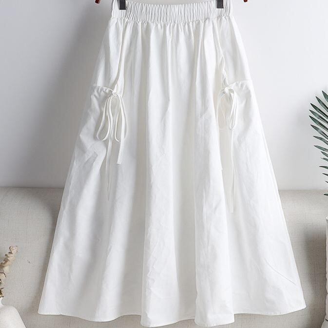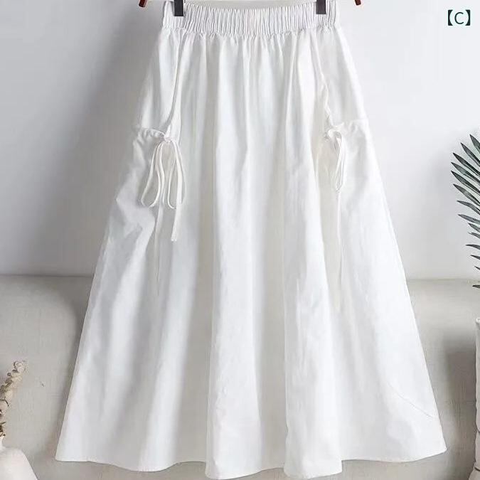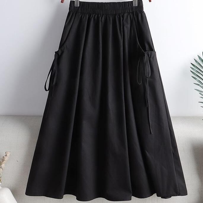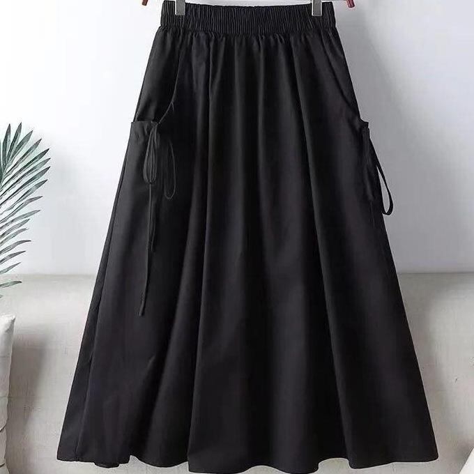 スカート レディース 韓国ファッション 無地 ウエストリボン ドローストリングポケット ミディ丈 Aライン 大きいサイズ ゆったり ポリエステル素材 微ストレッチ 工装風 カーキ ブラック