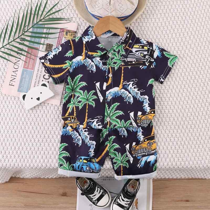 キッズ 男の子 半袖 シャツ ショートパンツ セットアップ ハワイアン柄 アロハ ビーチウェア 夏服 薄手 綿 コットン 柔らかい 上下セット カジュアル リゾート ベビー 幼児 2点セット 黄色 スカイブルー ネイビー