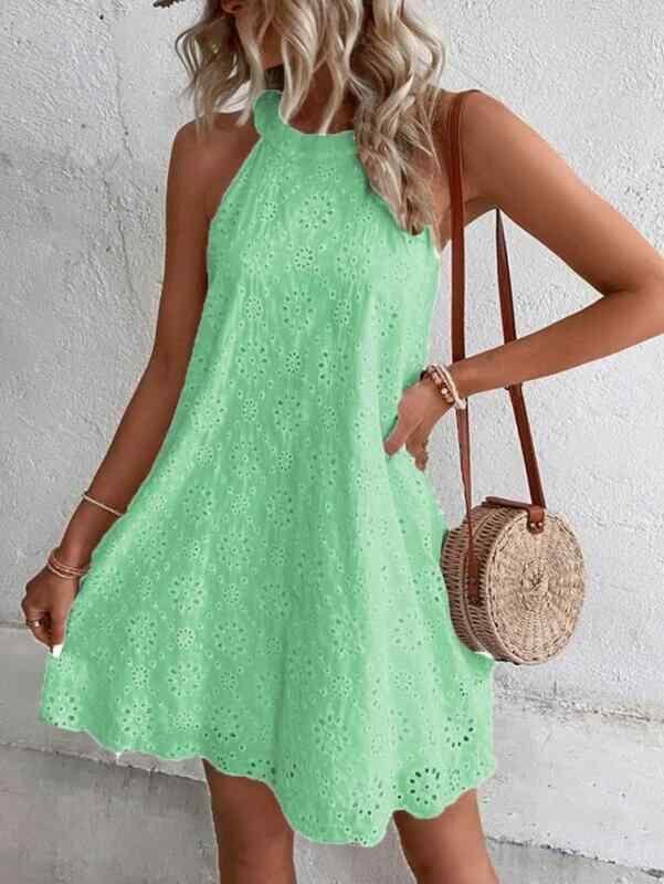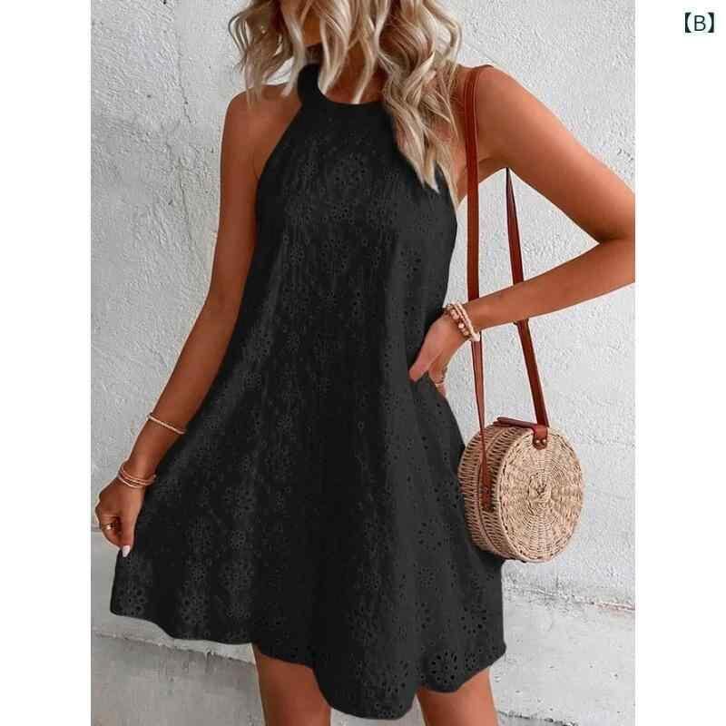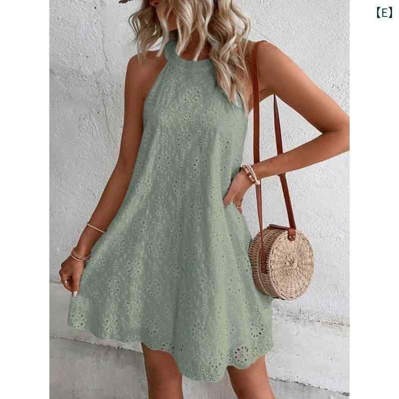 ワンピース レディース レース ホルターネック ノースリーブ ボタン 無地 綿混 ポリエステル混 ミディ丈 ミモレ丈 ゆったり リラックスフィット フロントボタン フェミニン ガーリー スイート