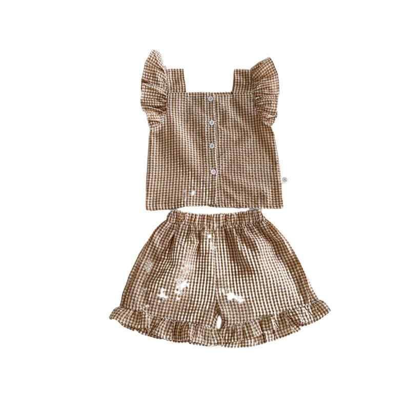 ベビー 女の子 セットアップ 韓国ファッション 半袖トップス ロングパンツ ドットチェック柄 綿素材 快適 通気性 普段使い 部屋着 お出かけ 夏服 黒 ブラック コーヒーブラウン ブラウン系 子供服 上下セット