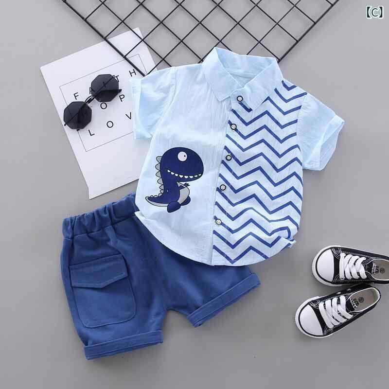 セットアップ 男の子 ベビー キッズ 半袖 シャツ ショートパンツ 恐竜柄 カートゥーン柄 プリント 2点セット 夏服 夏物 綿 コットン 柔らかい 薄手 カジュアル 前開き