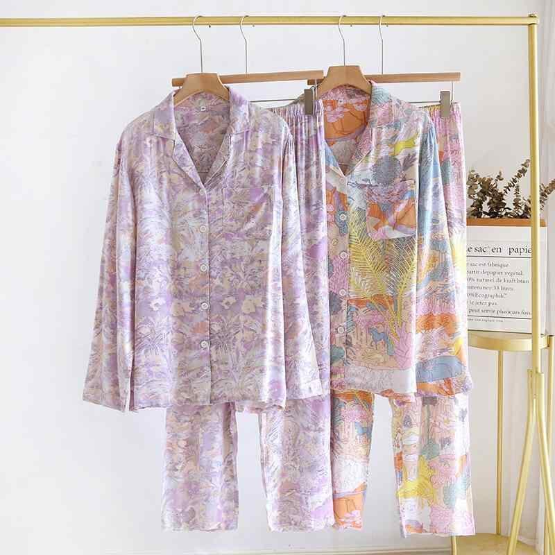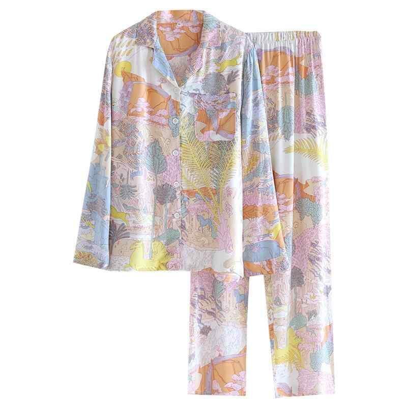 ・カテゴリ: セット ・主な素材: レーヨンサテン (レーヨン95%以上) ・厚さ: 薄手 (約121-140g/平米) ・ネックライン: 襟付き ・袖丈: 長袖 ・丈: ロング丈 ・機能: リラックス、通気性 ・シーン: ルームウェア ・対象: レディース ・スタイル: シンプルカジュアル ・カラー展開: パープル、マルチカラー、フォレストグリーン ・サイズ展開: M、L、XL