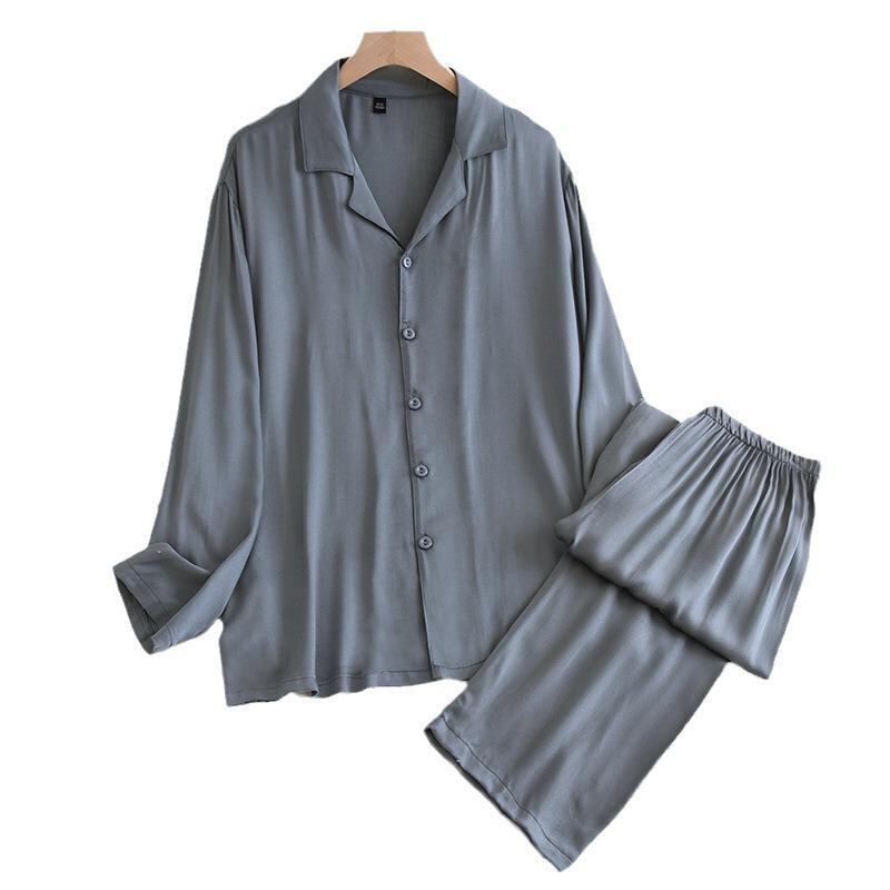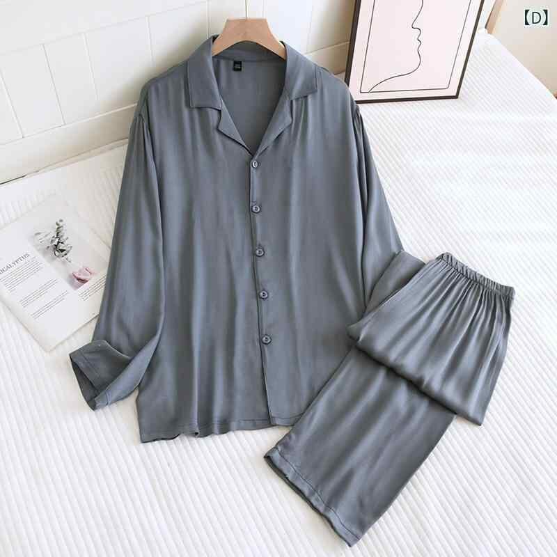 ・カテゴリ: ルームウェアセットアップ ・スタイル: シンプルカジュアル ・主な素材: レーヨン95%以上 ・生地: サテン ・厚さ: 薄手 ・ネックライン: 襟付き ・袖丈: 長袖 ・パンツ丈: ロング ・特徴: 授乳対応、通気性、快適な着心地、保温性、涼感、外出着兼用 ・カラー展開: ダークパープル、ライトグリーン、オレンジピンク、グレイッシュグリーン、カーキ ・サイズ展開: M、L、XL、XXL