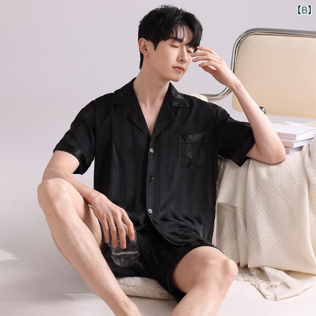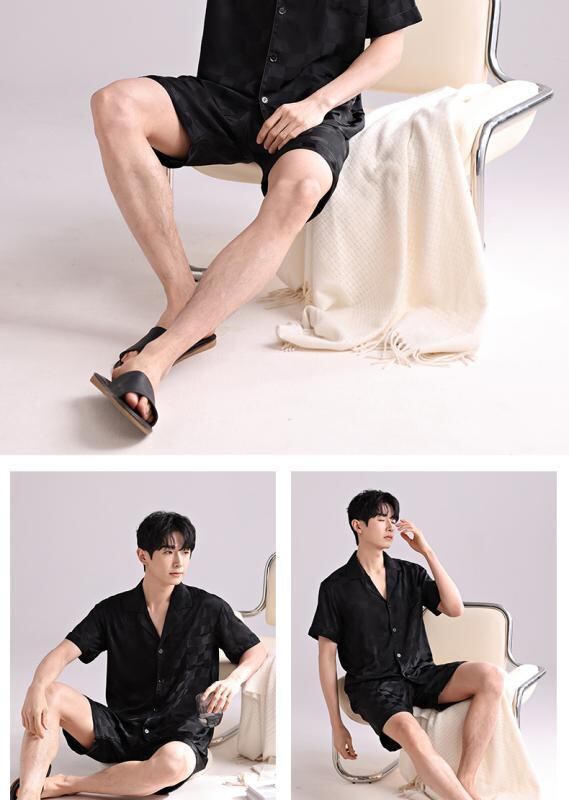 パジャマ メンズ セットアップ 春 夏 接触冷感 通気性 吸湿速乾 軽量 薄手 快適 フェイクシルク サテン 開襟 半袖 ショートパンツ シンプル カジュアル ルームウェア 部屋着 ワンマイルウェア