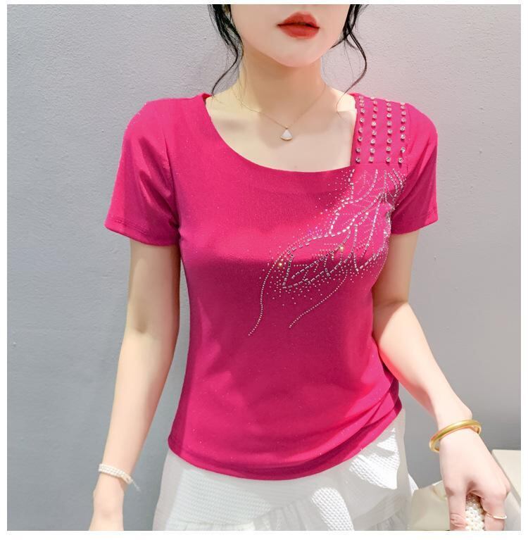 Tシャツ レディース 半袖 メッシュ素材 ラインストーン ビーズ装飾 切り替え アシンメトリーデザイン 幾何学柄 花柄 プリント スリムフィット 大きいサイズ