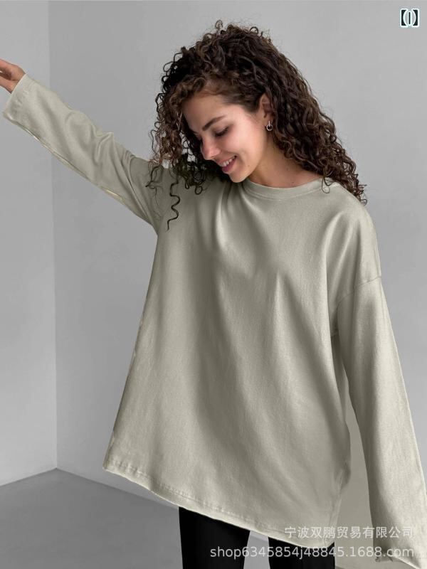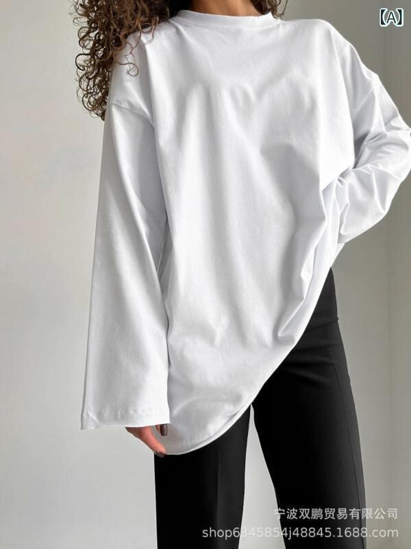 Tシャツ レディース 綿100% 長袖 クルーネック ゆったり オーバーサイズ 手加工 ダメージ加工 ミドル丈 トップス 日韓カジュアル