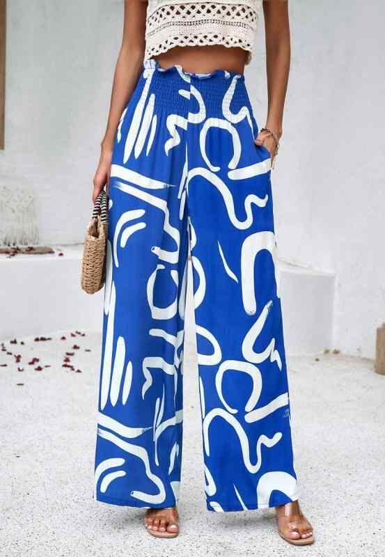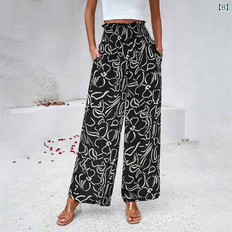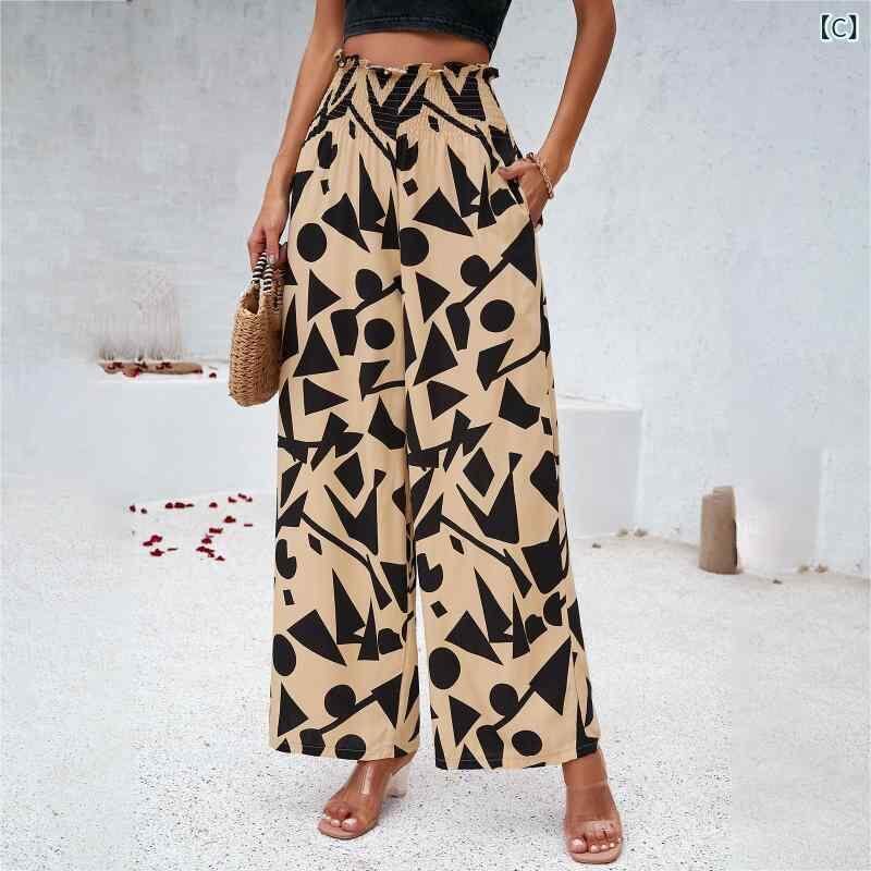 ワイドパンツ レディース ゆったりシルエット ロング丈 レーヨン素材 竹節織り プリント柄 ミドルウエスト 伸縮性 エレガント きれいめ カジュアル オフィス 通勤 リラックス ネイビー ブラック イエロー グリーン