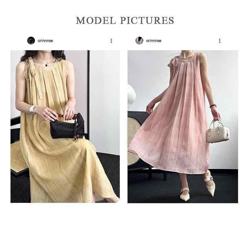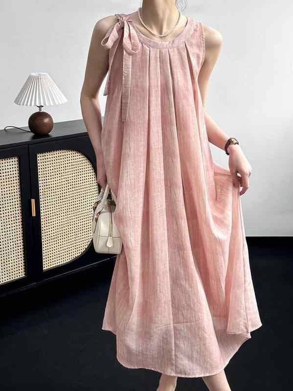 ワンピース レディース 韓国ファッション レトロ クラシック リボンデザイン ゆったり Aラインシルエット ラウンドネック ノースリーブ ミディ丈 ポリエステル素材 普段使い お出かけ ピンク ライトグレー イエロー